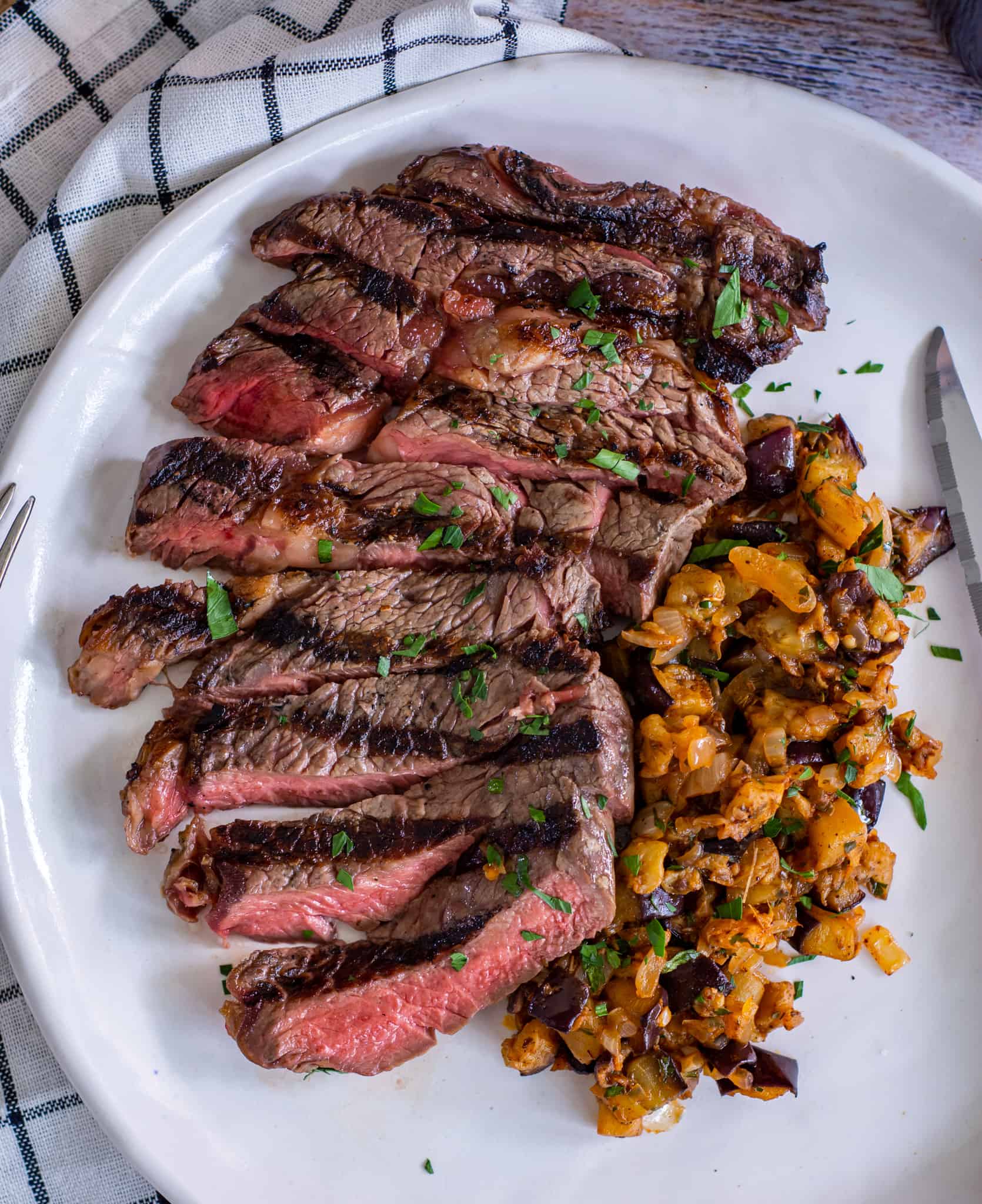 Ribeye fillet & spiced eggplant is my latest "creation". We eat a good amount of steak in our house but not a ton of eggplant. So I'm on a bit of a mission to incorporate more eggplant into our diet. This spiced eggplant recipe is simply divine. Layers of flavour in it and it goes well with multiple proteins - more on this later. So, read on and get grilling some steak & eggplant!