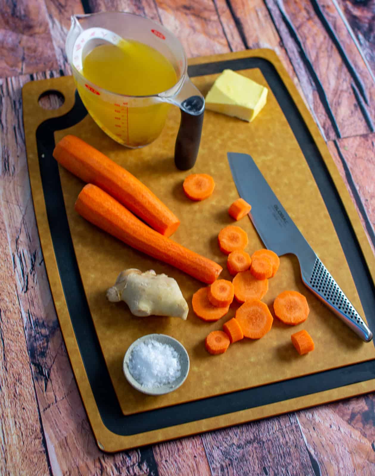 It doesn't get any easier than making a puree. Chop your veggies into even sized pieces. I like mine to be about an inch thick so that they can take on more of the delicious ginger notes when cooking. Add a knob of ginger to the pot along with the stock and simmer until fork tender. Then just pop the carrots and braising liquid (minus the ginger) into a blender with a knob of butter and blitz until smooth.