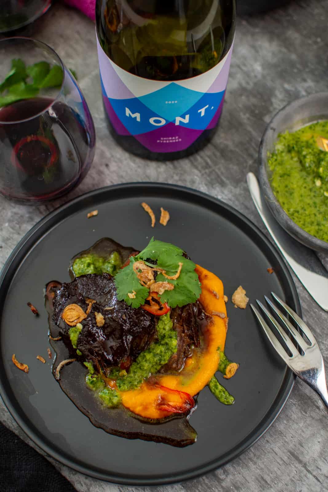 asian slow cooked beef cheeks in black plates, mont shiraz wine bottle