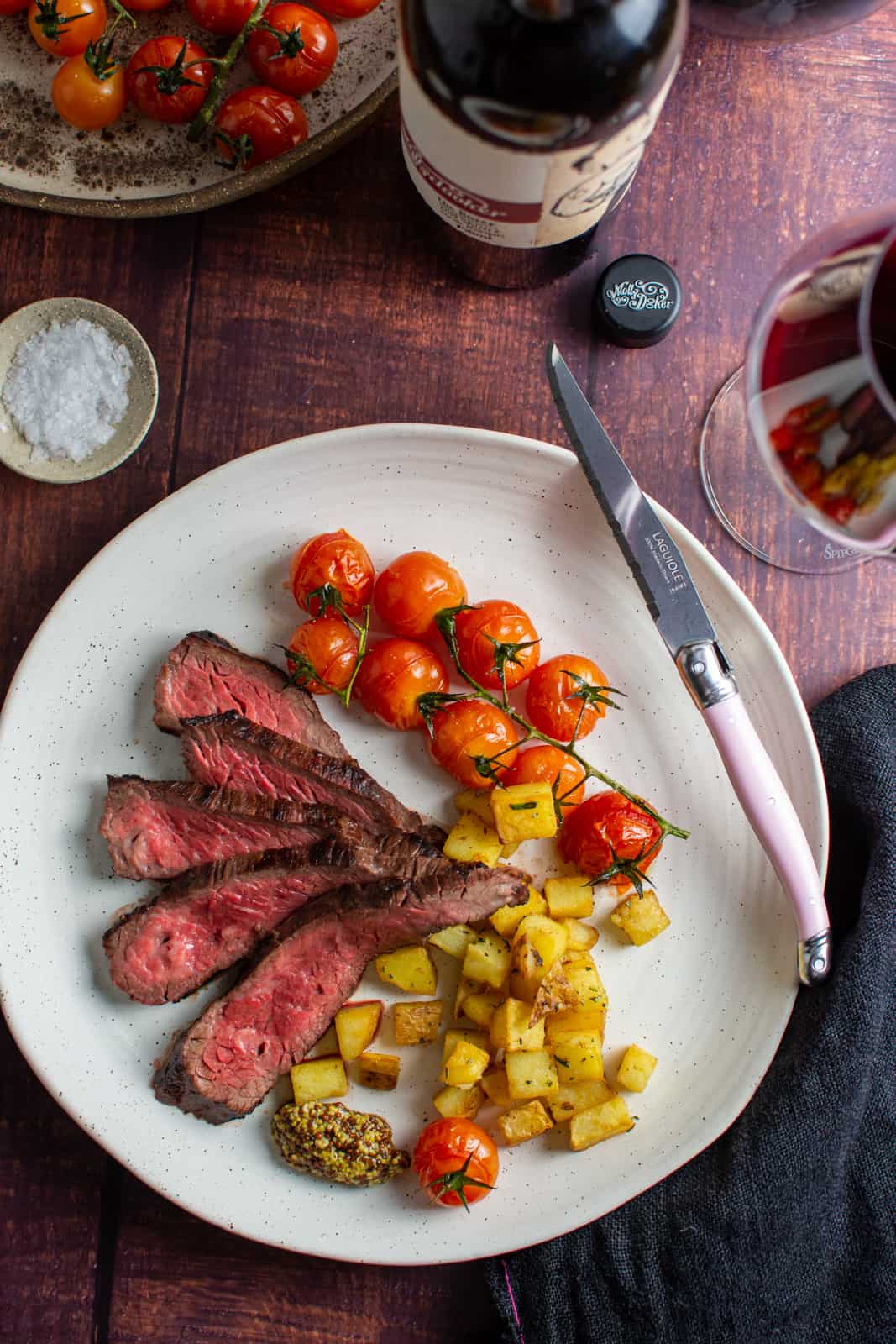 - Slice your steak and serve with vine tomatoes, potatoes and either a jus, mustard or whatever sauce you enjoy with your steak