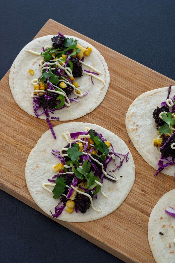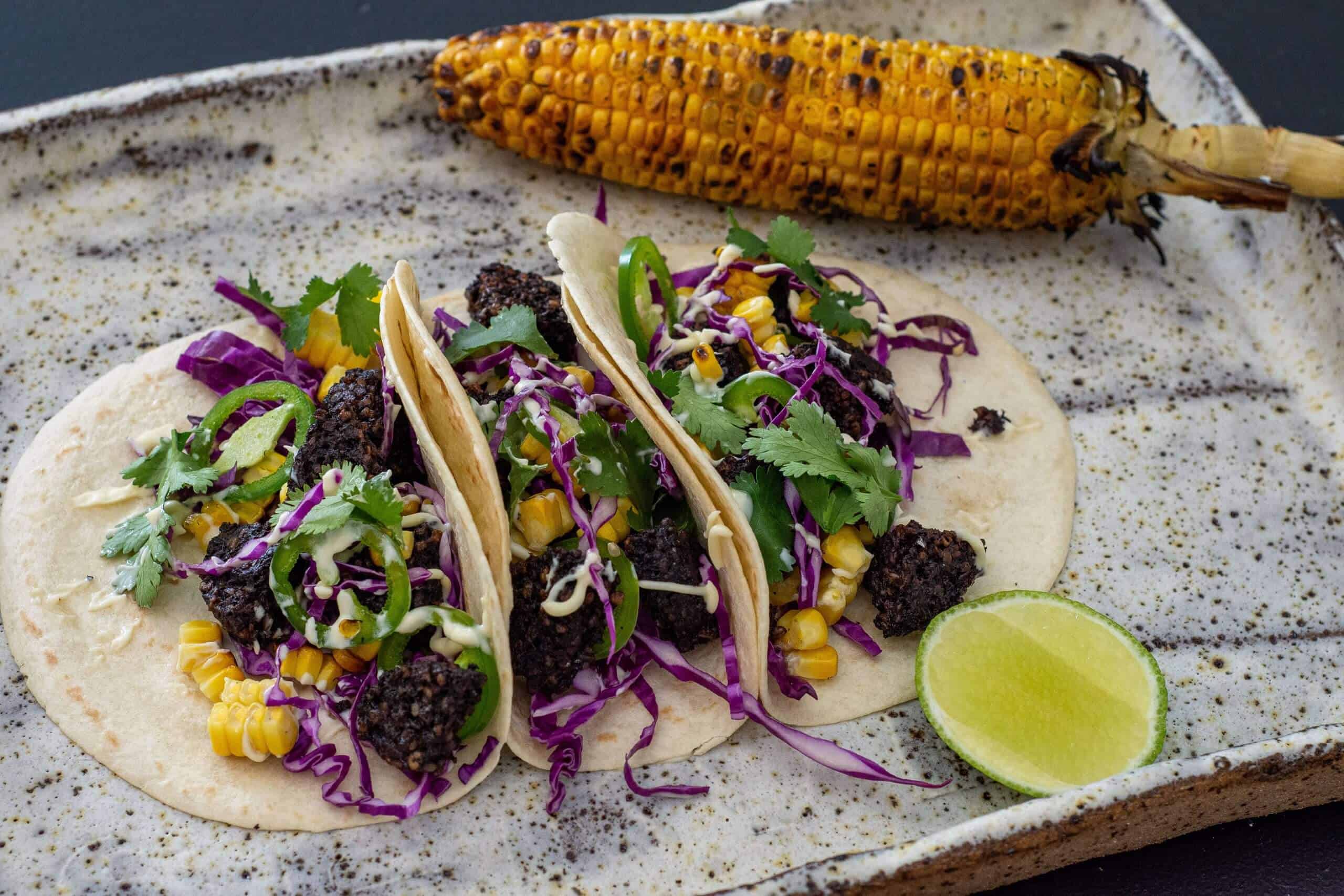 Keeping it pretty classic and simple with the toppings for these ones and letting the glory that is black pudding sing. Warmed tortillas, some simple shredded red cabbage, charred corn, coriander and the all important crispy black pudding. Well, they wouldn’t be black pudding tacos now would they without it!!