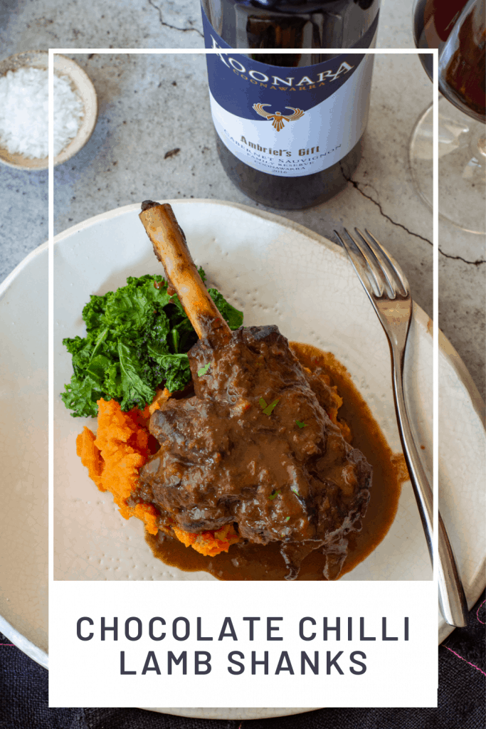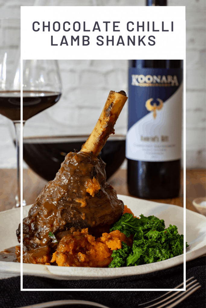 What's better than a delicious bowl of braised lamb shanks, chocolate chilli sauce and mashed sweet potatoes? You guessed it, a glass of Koonara 'Ambriels Gift' Cabernet Sauvignon alongside it!