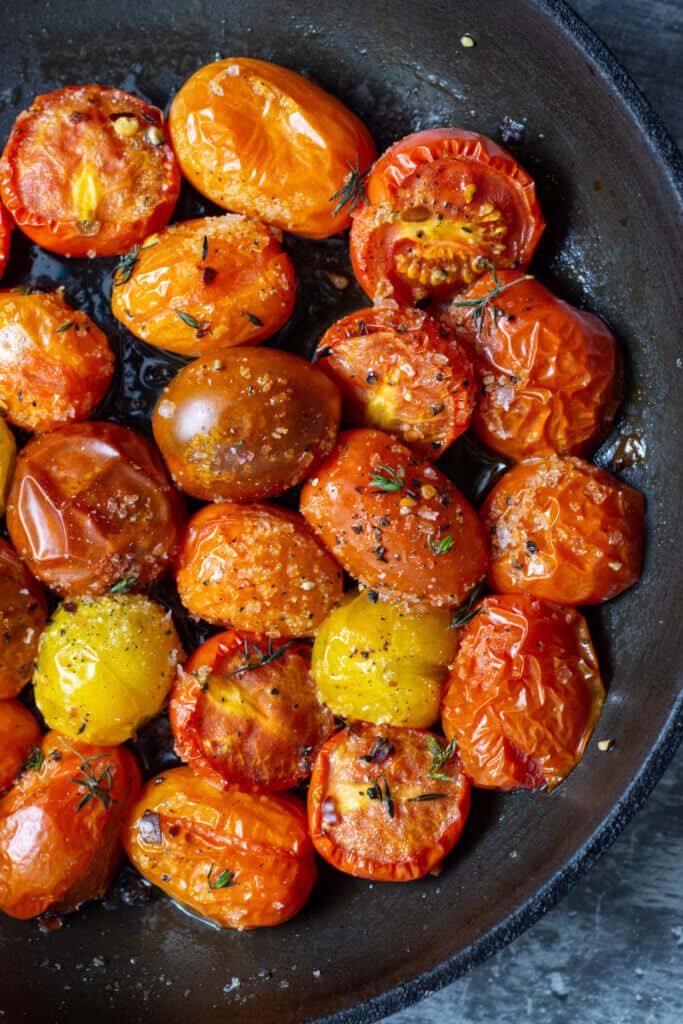 It does EVERYTHING to tomatoes. Trust me, the next time you roast tomatoes keep one aside and do a taste test of raw chopped tomato and one that has been slow-roasted. Mind blown. What slow-roasting them does (aside from the obvious cooking them) is it releases all the natural sugars and juices from the tomatoes. It intensifies the flavour and adds a whole different dimension to this dish.