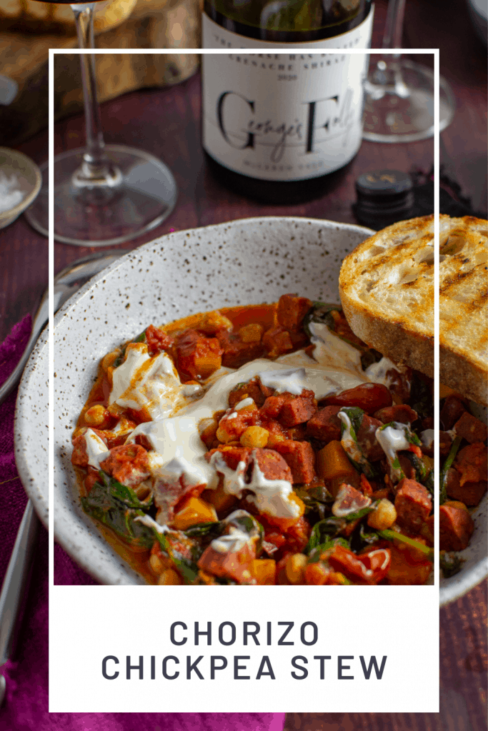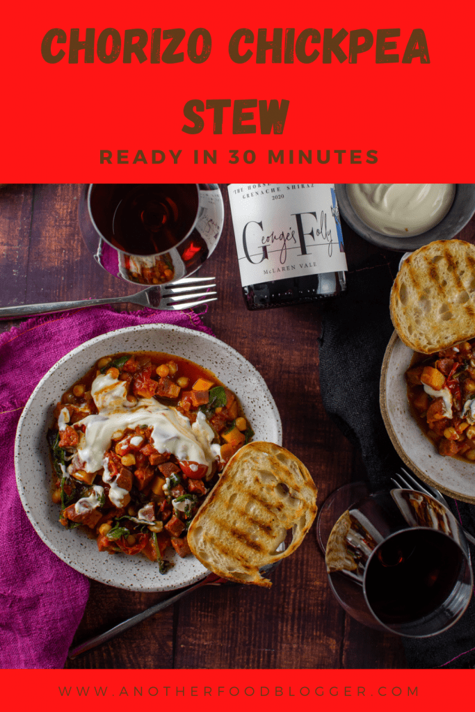 It wouldn't be a recipe on my site without an epic wine pairing now, would it? This chorizo and chickpea stew as you guessed is paired with The Horse Has Bolted Grenache Shiraz from George's Folly.