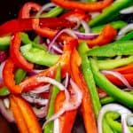 - Fry the peppers & onions with oil on medium - high heat. Add seasoning and splash of sherry vinegar close to the end. These should take 8 - 10 minutes.