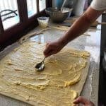 - Spread the softened butter over the dough using the back of a spoon. Sprinkle the brown sugar & cinnamon onto the buttered dough, pressing them gently onto the dough.