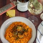 - Add oil and butter to a saucepan on medium heat and sweat onion and garlic until soft