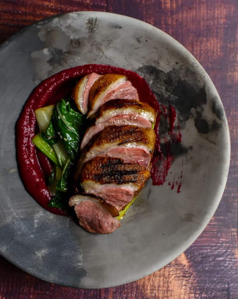Place the duck breast into a cold pan and on a low heat allow the pan to heat up slowly while the duck is in the pan. This process allows as much fat as possible to release and for the skin to brown and crisp up nicely, after approx 8 minutes, flip the breast and cook for 2 minutes skin side down. At this stage, I place the duck on a wire rack and into the oven for a further 3-4 minutes until the internal temperature is 52c. Remove from the oven and leave the duck to rest on the rack for 8 minutes before slicing. Resting is crucial as it allows the juices to redistribute, leaving you with a beautifully pink duck breast.