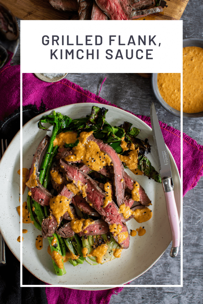 So many things to love about this grilled flank steak dish with kimchi sauce. Let's start with the fact that in under 30 minutes, you can feed a crowd (BBQ size depending!). Low on the carbs front yet very filling, it's a great one for when you are hungry too. The kimchi sauce - whilst easy AF to make is full of flavour and works great not only with steak but pork, chicken or grilled vegetables too.