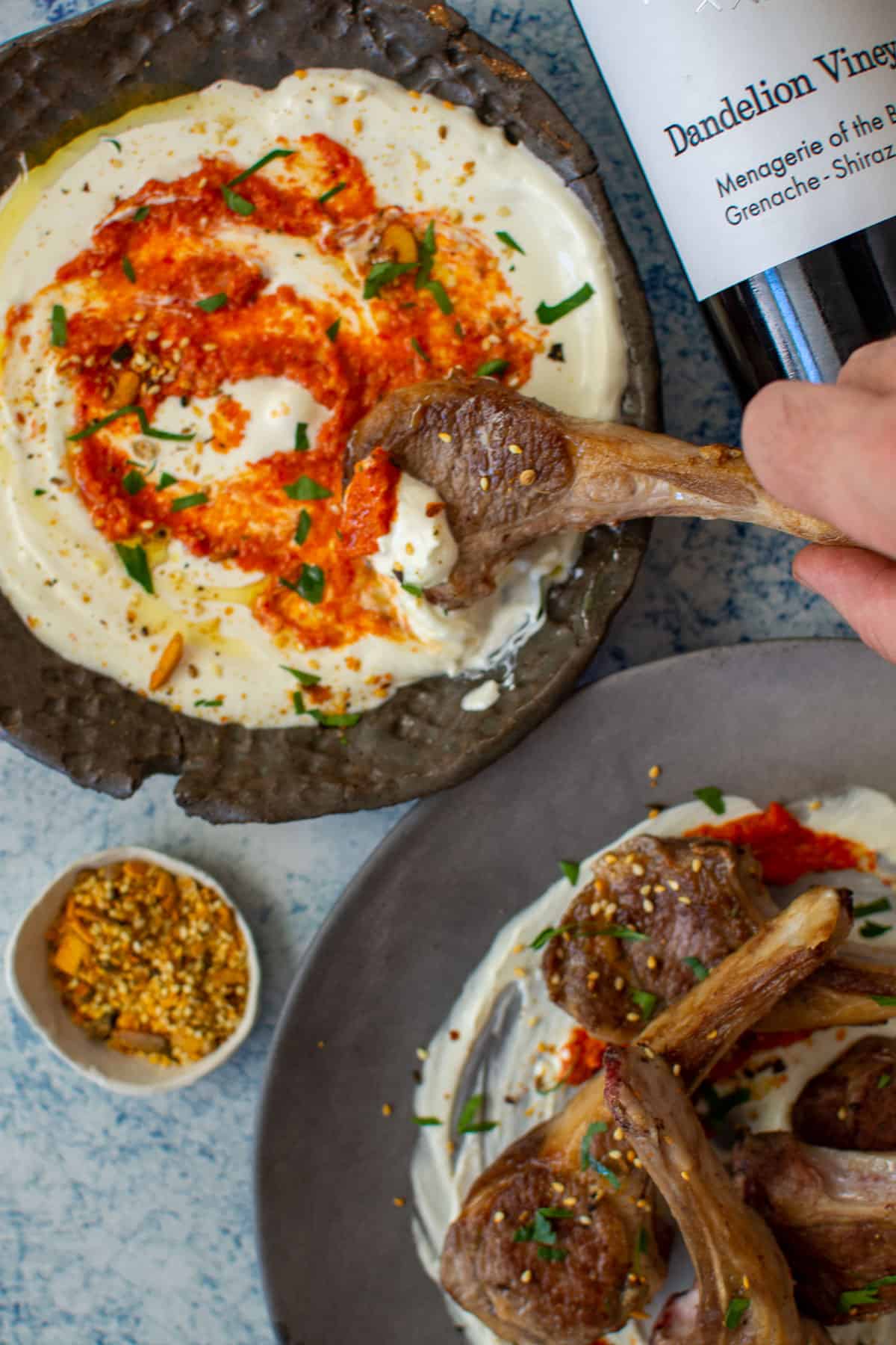 These lamb chops are so full of flavor and spice then it's cooled down with the creamy Labneh. The wine pairing is great to have too.