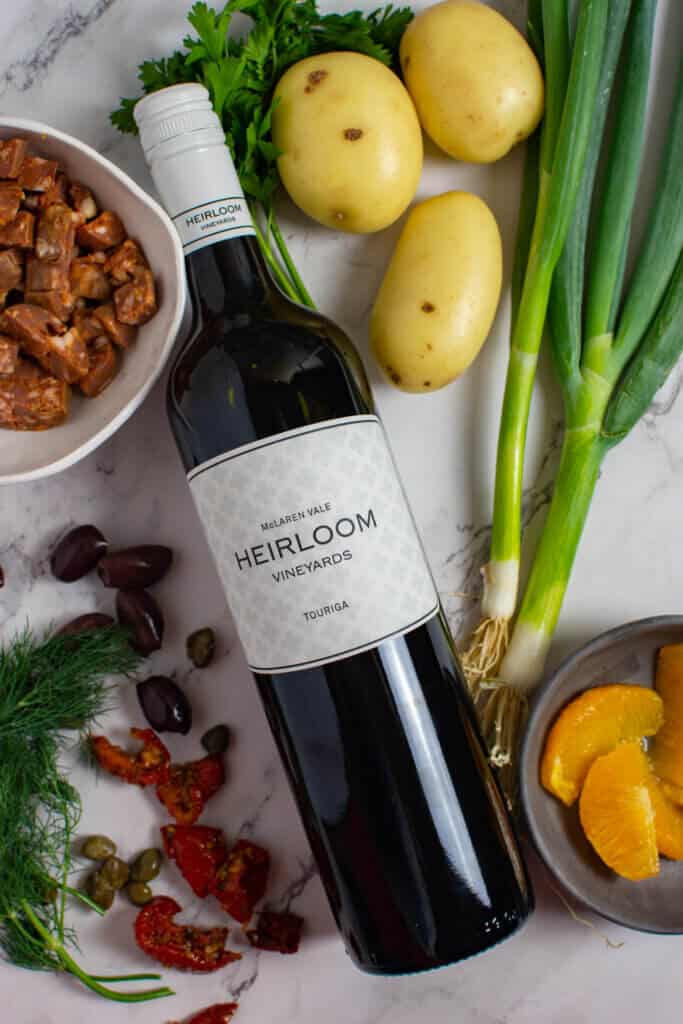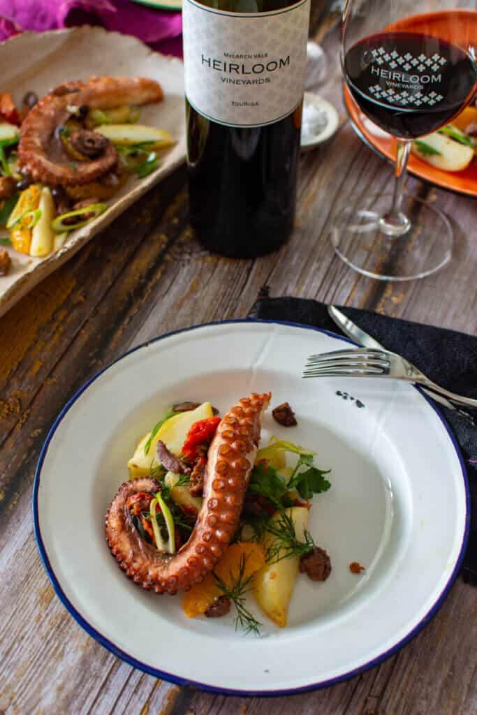 So as you can tell from the grilled octopus salad we have used Mediterranean flavours. When I think of grilled octopus my mind jumps to Spain, Italy, Greece & Portugal. Sitting in the warmer weather, drinking good wine amongst family & friends. That's exactly the ethos behind this wine - Heirloom Vineyards 2019 Touriga. Touriga, known as Touriga Nacional in Portugal is considered one of their finest grapes. Typically small grapes with low yields that produce intensely drinkable wines. It's a wine that works AMAZINGLY with food and one that will get better and better over years. All the more reason to pick up 6 of them 😉