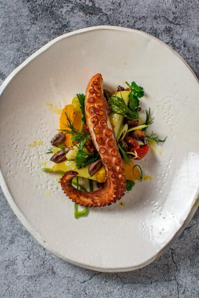 Octopus works GREAT with citrus and spice. Think lemony hummus, harissa, chorizo, nice citrus or saffron risotto, paella. All these dishes are cracking with octopus. So with this in mind, I created this delicious grilled octopus salad full of beautiful Meditteranean flavours.