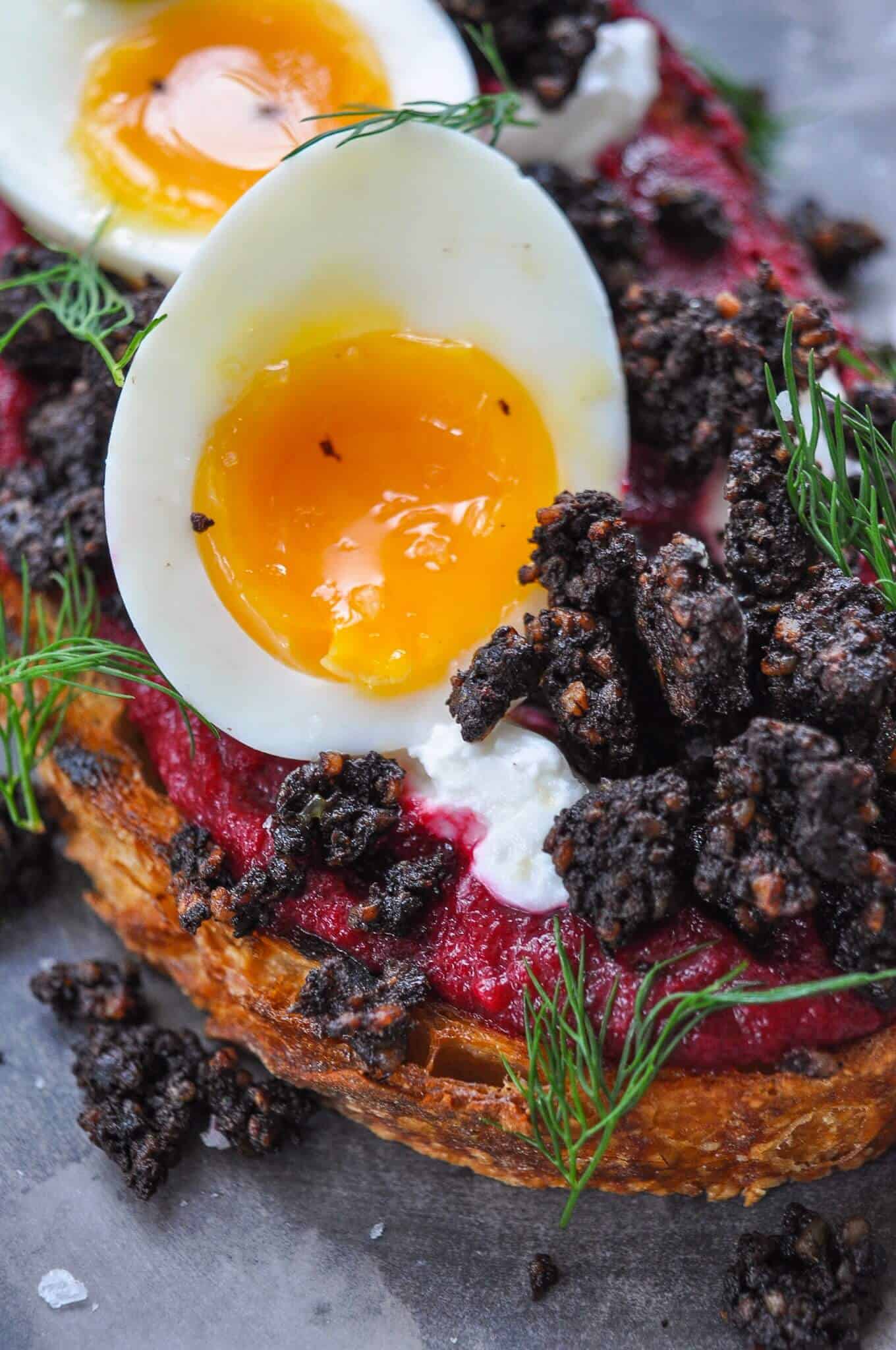 - Smear hummus onto sourdough toast. Cut soft boiled egg in half and place in hummus. Spoon goats curd around the egg/toast and sprinkle black pudding on top. Garnish with dill - if using.