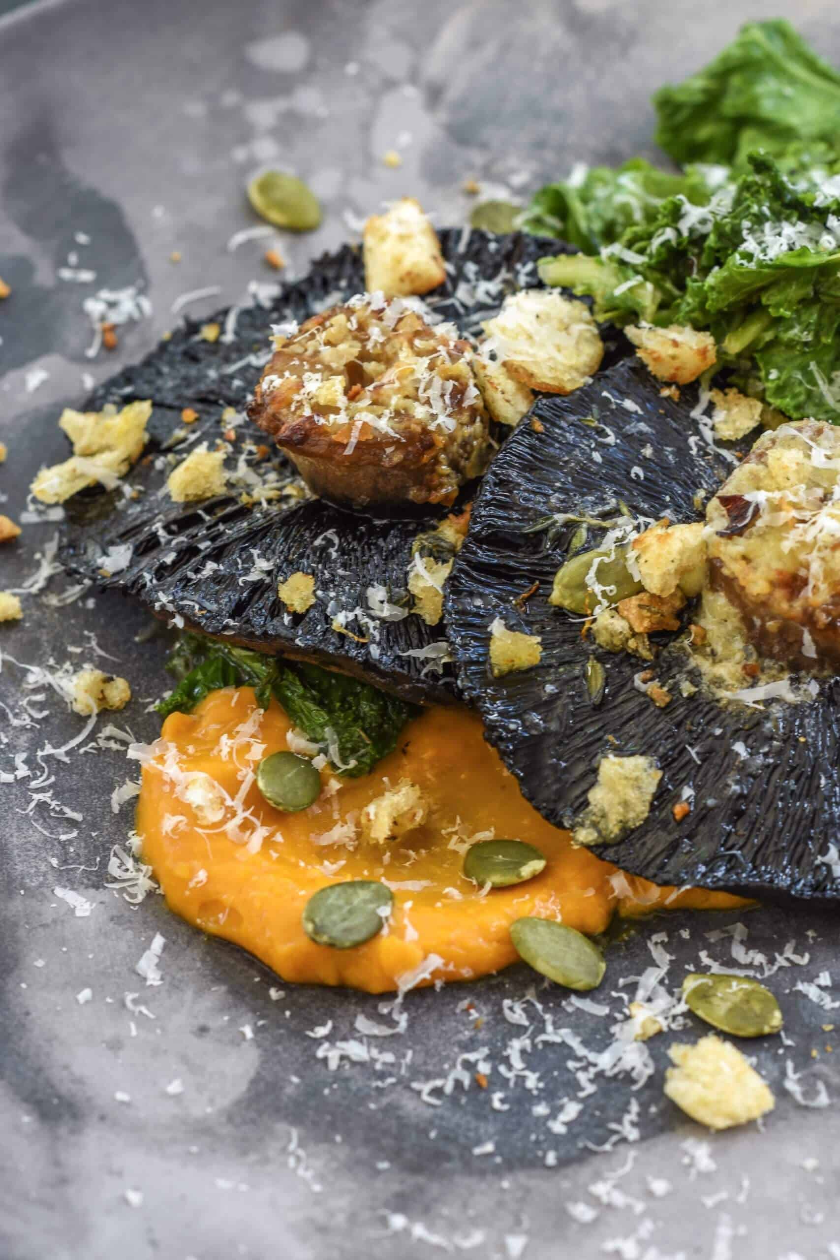 - Place a spoon of hummus on a plate and using the back of a spoon slide the spoon through the hummus. Place mushrooms on top of hummus and kale beside. Sprinkle pumpkin seeds, grated parmesan and breadcrumbs on top to finish
