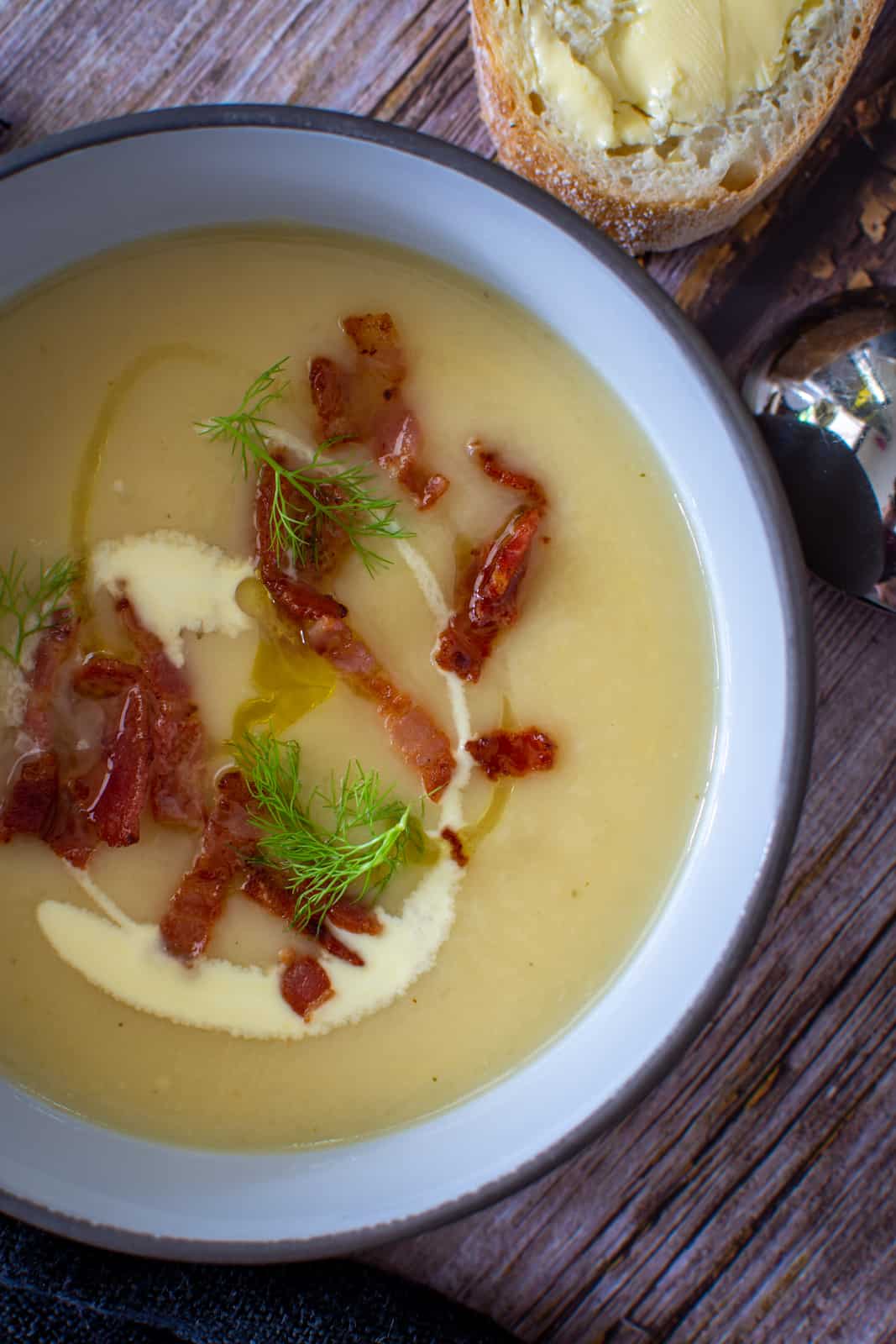 The base of most soups is onion, garlic & stock. If you can remember this then you are on the way to making most soups. After that, it's about choosing the right vegetable, spices and/or herbs. Here, with the addition of fennel, we get some lovely anise notes along with delicious maple flavour and saltiness from the bacon at the end. It's really a no brainer to make my parsnip soup!