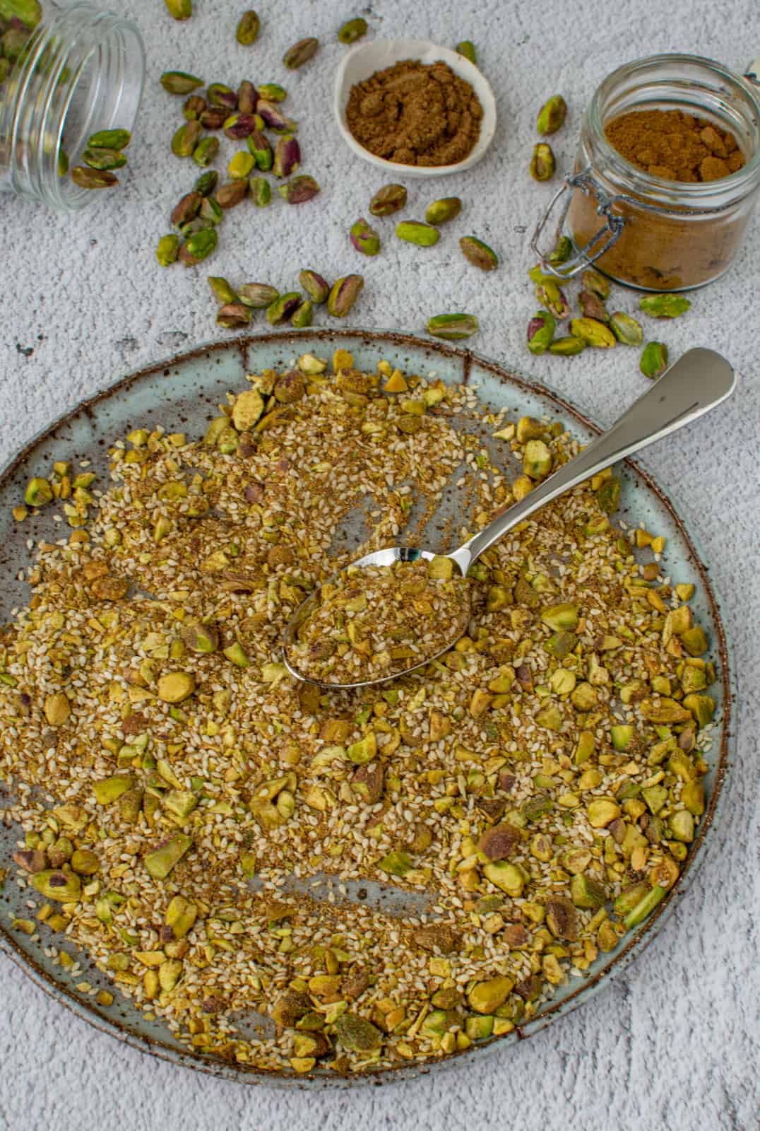 For those of you who don't know dukkah originated in Egypt and is typically a blend of salt, cumin, dried herbs, sesame and nuts. They are pounded together to form the blend. The word dukkah in Egyptian means to crush or to pound so it is literally a direct translation to the dish. So why not whip up my delicious pistachio dukkah and see for yourself!
