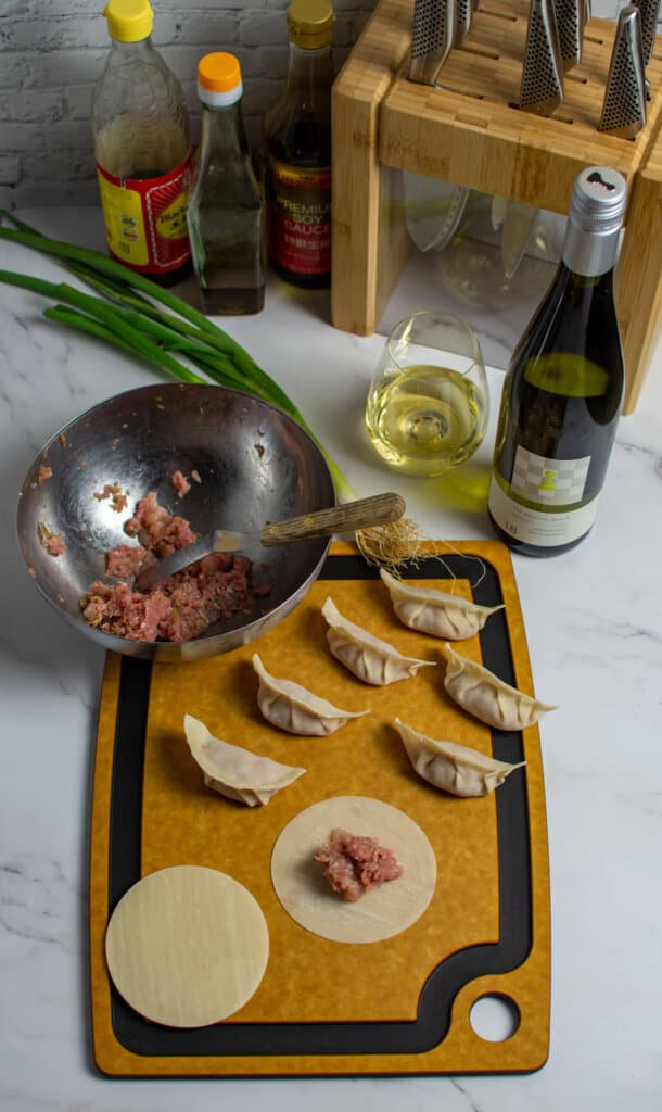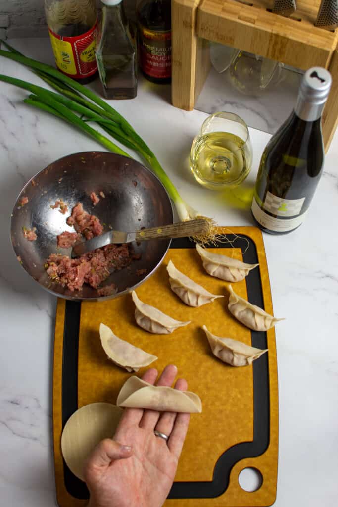 The key to folding them starts with the amount of filling you use. Start small and work your way up. Initially, a heaped teaspoon is enough to work with but after a while, you can add a little more. Rub a little water around the edge of the dumpling (this helps to bind them together) and get folding. If you want to make it easy for yourself then go with the old fold in a half-moon shape. Literally, just fold the dumpling in 1/2, press the air out gently and press the edges together all around.