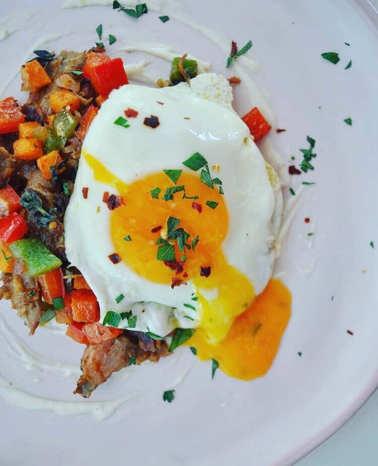 - To serve, place a smear/spoon/dollop of mayo/aioli on plate, spoon the hash mixture on to plate, top with fried egg and sprinkle of parsley.