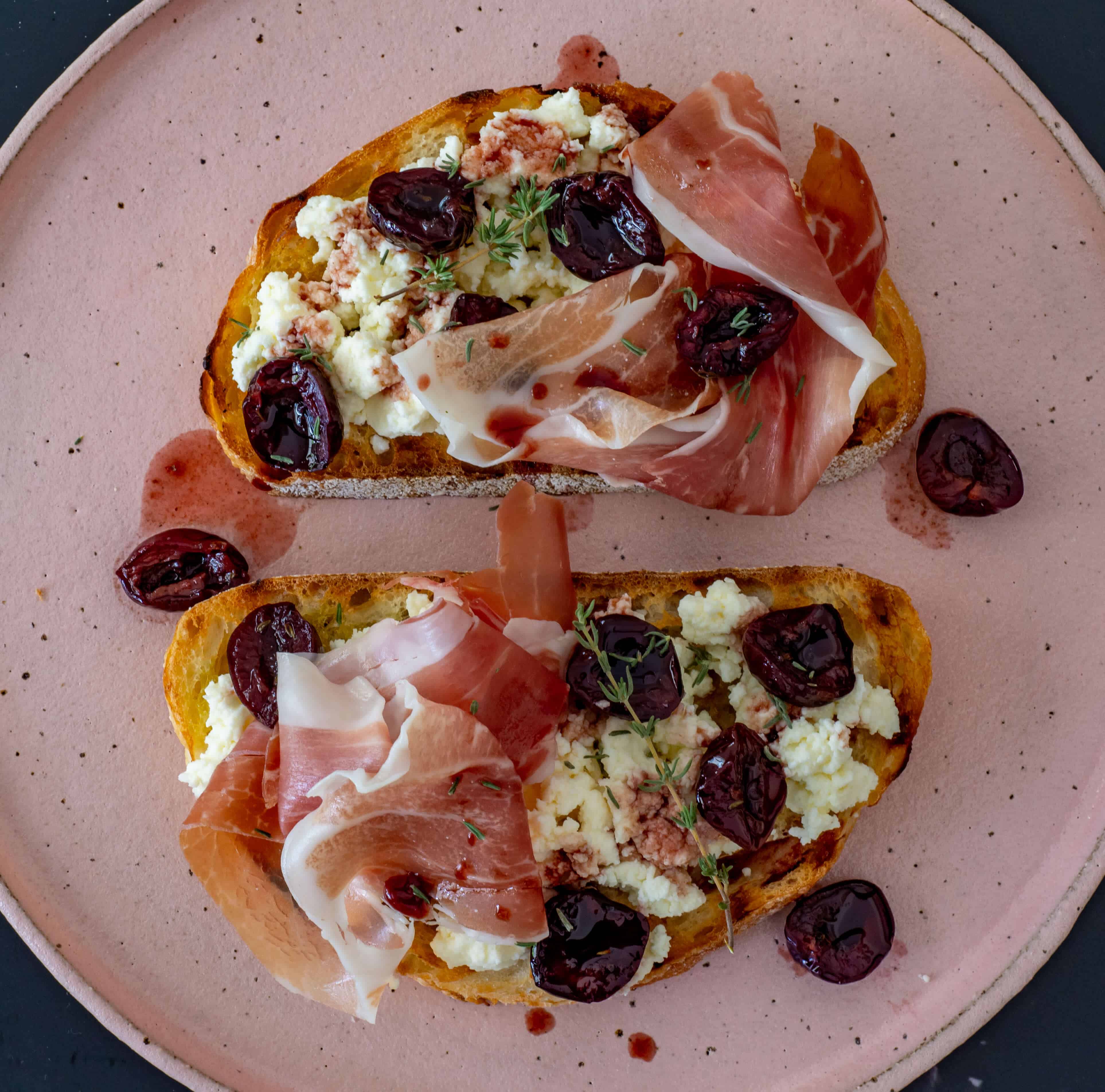 - Add a heaped tablespoon of ricotta to bread, "artfully" place ham on side of bread and pour a spoon of cherries (and juices) over the top. Sprinkle with thyme and some maldon salt too