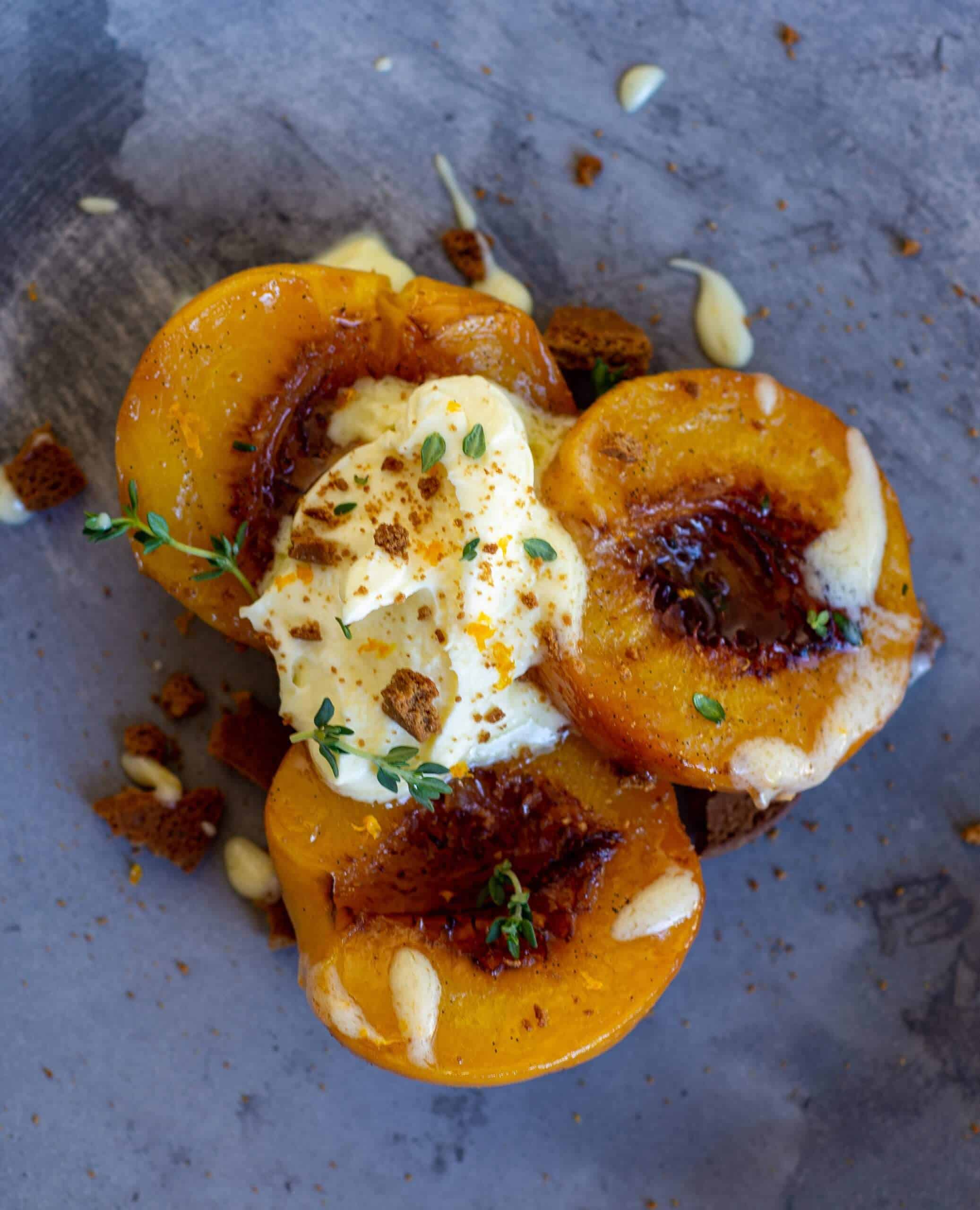 - Place peaches on plate, spoon mascarpone over the top (or on the side), crumble biscuit around peaches and sprinkle thyme on top. Finally drizzle some of the cooking butter on top and then DEMOLISH!