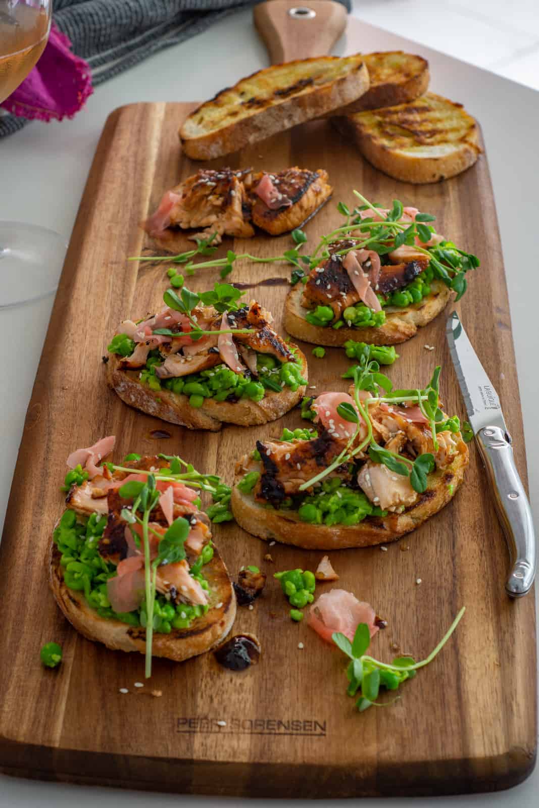 - Grill/toast the bread, top withcrushed peas, salmon and some of the sauce. Add some sushi ginger, sesame seeds and pea shoots to finish