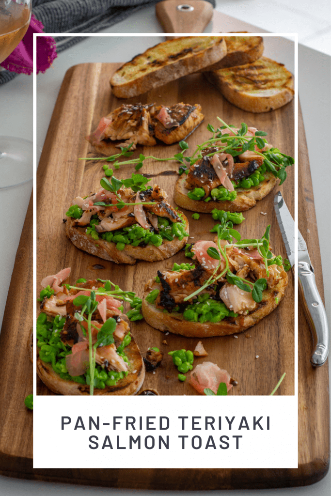Something a little different but no less tasty with this pan-fried salmon teriyaki dish. Simple crushed peas on top of grilled bread, a delish homemade teriyaki sauce, pea shoots and pickled ginger makes this teriyaki salmon toast one you will devour about 5 or 6 slices easily.