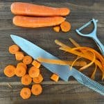 - Peel and chop carrots into 1cm pieces