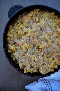 Instead of baking the mac n cheese you can add all the cooked ingredients into the cheese sauce pan and serve. Sprinkling some toasted breadcrumbs on top.