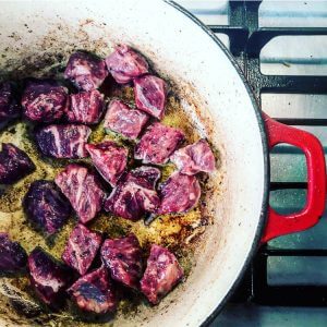 when frying the meat do so in batches, this allows temperature of pot/pan to remain high, therefore caramelizing the meat and adding a nice crust rather than grey looking meat