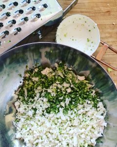 Using the largest side of the box grater, grate the cauliflower & broccoli into a large mixing bowl.