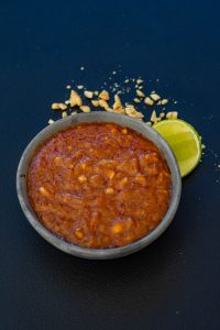 To make the sauce mix all the ingredients together (except the lime & chopped peanuts in a sauce pan and cook on a medium heat until thickened. Add lime & chopped peanuts at the end.