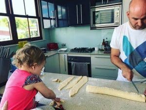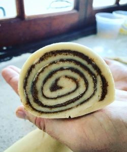 Roll up the dough to form a log (like an old school swiss roll) and pinch the seam closed. Cut the dough in half and then cut each half into equal sized pieces. Approx 7 per half.