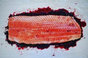 Discard the beetroot mixture and was salmon under cold running water.