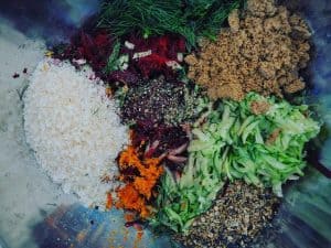 Mix all the ingredients together (except salmon) and combine well with your hands - USE A GLOVE