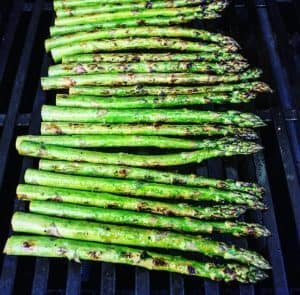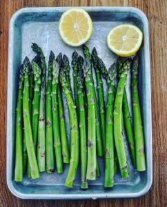 Grill asparagus & lemon on bbq or grill pan until nicely charred - approx 4 mins.