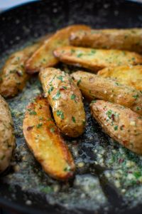 Once the potatoes are cooked toss them in the garlic butter and serve