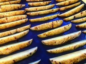 Cut the potatoes into wedges, insuring all are equal sizes. I usually cut mine in 1/2 and then into 1/4's or if they are slightly smaller then just in 1/2 and then into 1/3's.