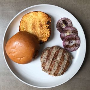 Oil, season & grill burgers & red onion and grill them on the bbq or in grill pan for 2 & 1/2 mins each side. Leave rest for a further 2 mins.