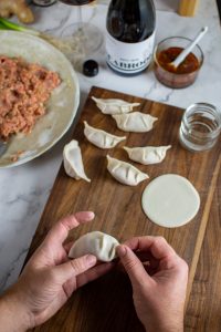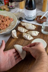 To add 2 folds/pleats to each side of your dumpling you need to crimp/fold one side of the wrapper back towards the center to make a pleat. Repeat this with the other side until you have 2 identical pleats.
