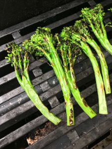 Rub stemmed broccoli in olive oil, salt and pepper and grill on bbq or grill pan for 3 - 4 mins.